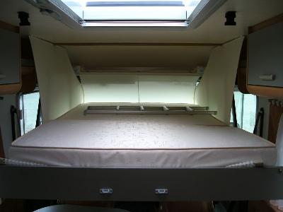Salon composé de deux banquettes latérales de 1.60m,sièges avants pivotants.Lit de pavillon+lit de salon.Cuisine en L avec de nombreux rangements,frigo indépendant de la cuisine.Toilettes à l'arrière,avec douche séparée. Grande penderie,plusieurs rangements.